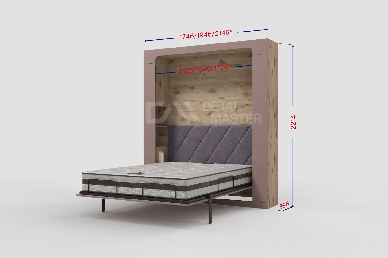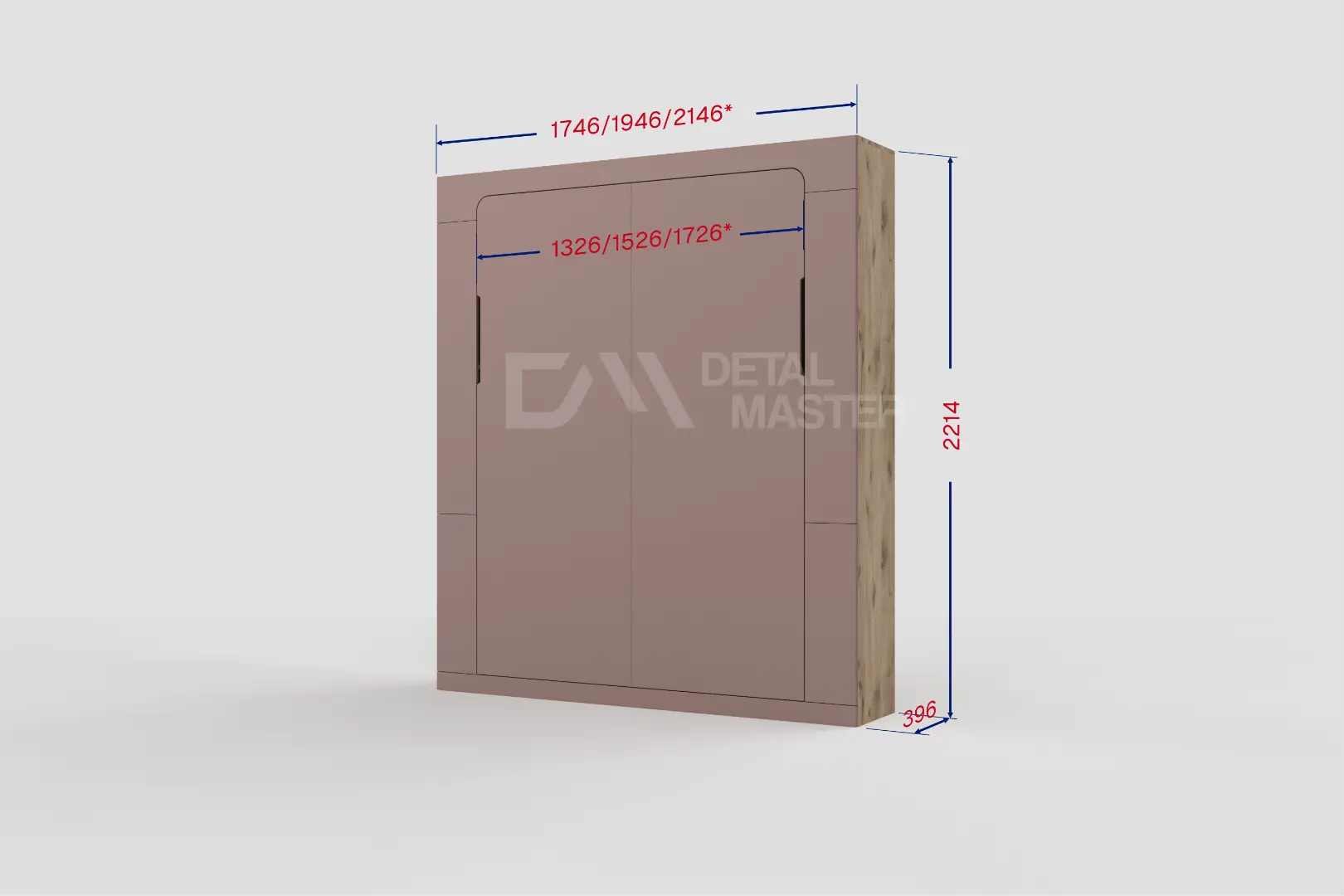 Фасад шкаф-кровати выполнен из МДФ супер матовый Пудра, со сглаженными краями. Что позволит обезопасить вас от ударов при ходьбе возле кровати в разложенном положении и добавит изысканность модели шкаф-кровати. Корпус выполнен из ЛДСП декор Небула. По бокам модель оснащена полками для хранения вещей с закрывающимися дверцами.