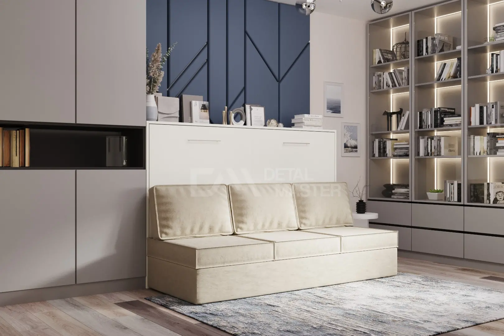 Горизонтальная шкаф-кровать с диваном "Galaxy Start". Работает на механизме раскладывания собственной разработки "Start". Кровать раскладывается легким движением руки, превращаясь в полноценное спальное место. Просто потяните ее за ручки, расположенные на фасаде и выставите ножки-опоры.