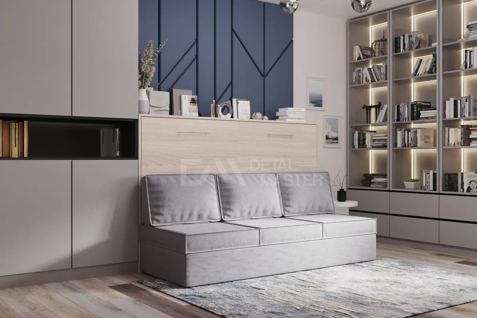 Горизонтальная шкаф-кровать с диваном "Galaxy Start". Работает на механизме раскладывания собственной разработки "Start". Кровать раскладывается легким движением руки, превращаясь в полноценное спальное место. Просто потяните ее за ручки, расположенные на фасаде и выставите ножки-опоры.